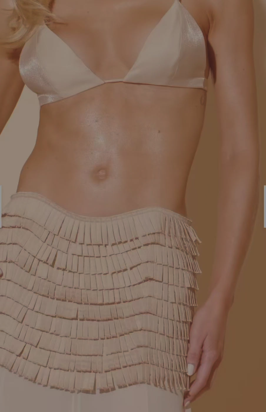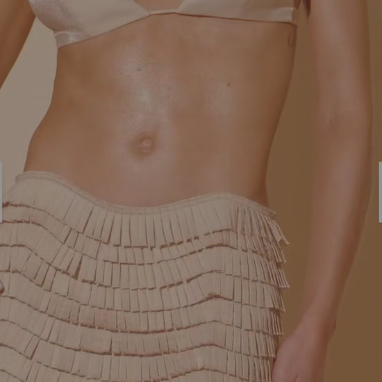 Resort wear 2026 | Long low waisted skirt in a mix of fabrics, which combines elegance and structure in the part of the mini skirt, highlighting a subtle and sophisticated silky shine. The frontal anatomical curves and the manual application of biases create a striking and unique visual effect. The bottom, made of soft transparency fabric, gives length, lightness and fluidity to the movement, with a soft touch and delicate fit. The back closure is made by invisible zipper, ensuring a clean and elegant finish.