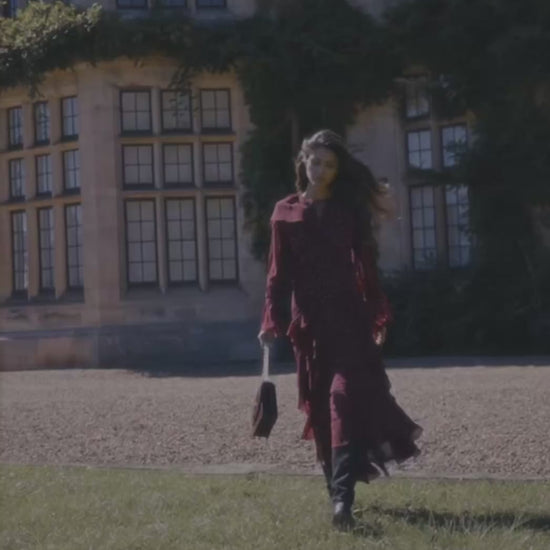 A design that radiates femininity and movement. This long burgundy chiffon dress with delicate beige polka dots combines elegance and personality with an unmistakable romantic air. Its fluid cut and multiple cascading ruffles create a light and enveloping visual effect, perfect to stand out on any occasion. The long transparent sleeves end in delicate flared cuffs, while the neckline with subtle lace and the fitted body enhance the silhouette in a natural way.