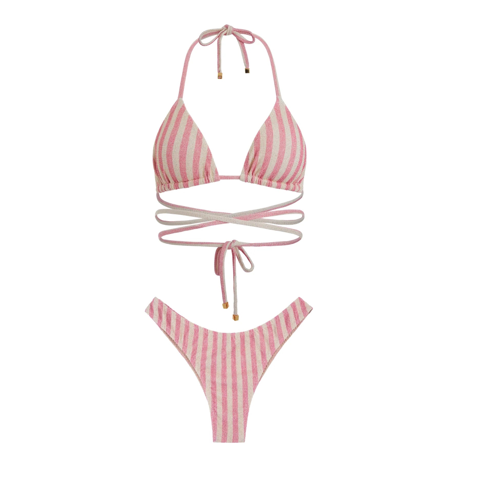 Introducing the Cristalle Bikini Triangle Set, a definition of luxury swimwear. Crafted from opulent lurex fabric, its shimmer dazzles under the sun. The triangle top boasts adjustable long straps for a personalized fit, while the high-leg bottom offers a daring look. For those seeking a touch more modesty, opt for the high-waist bottom.