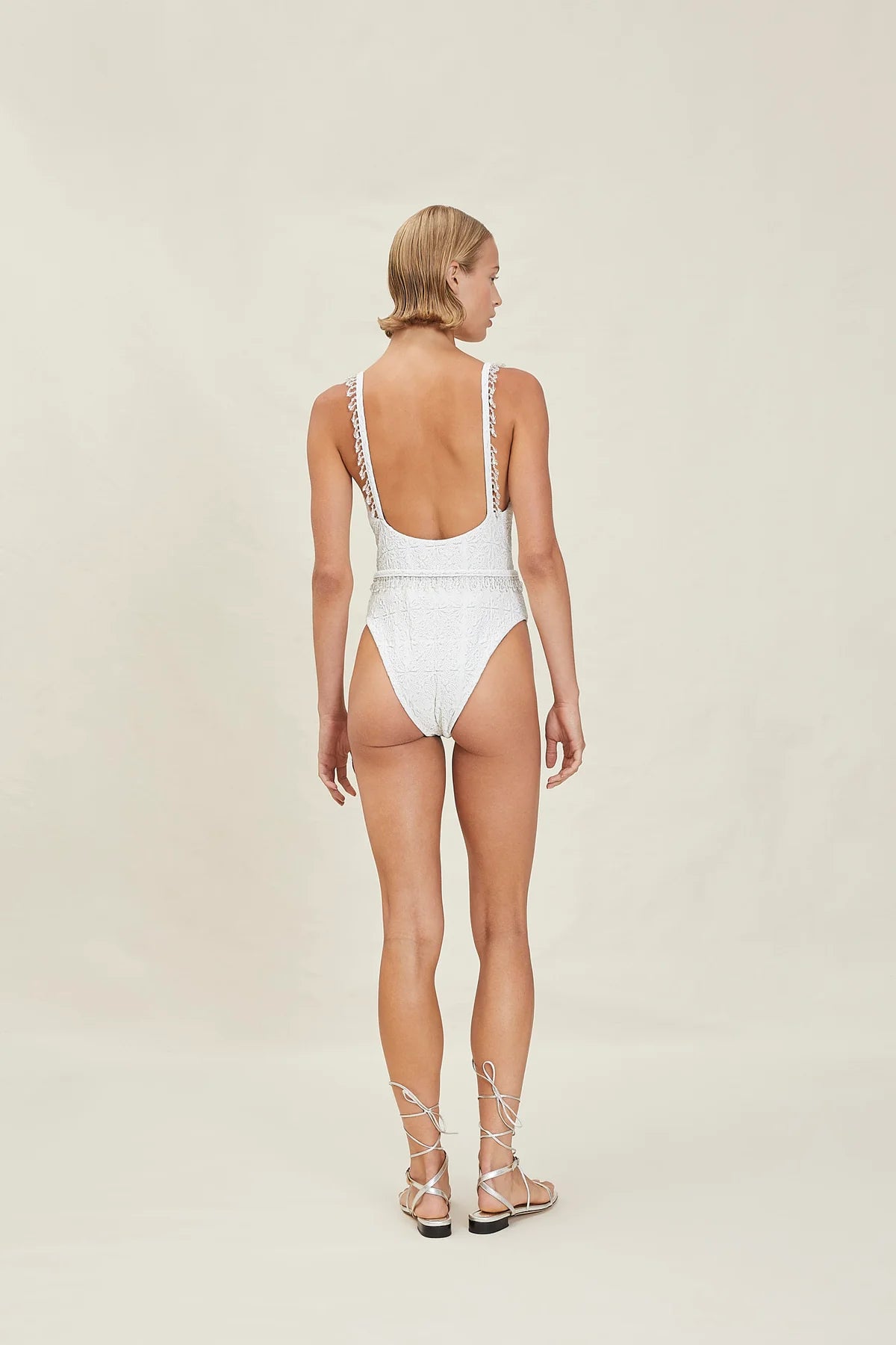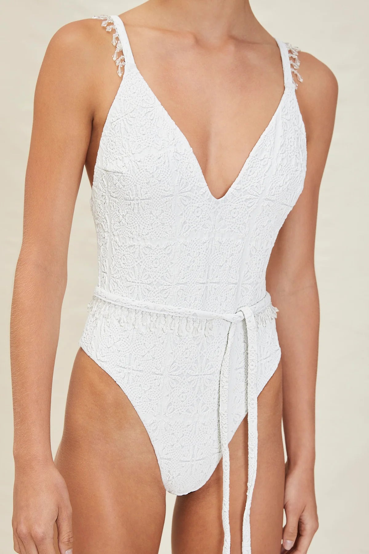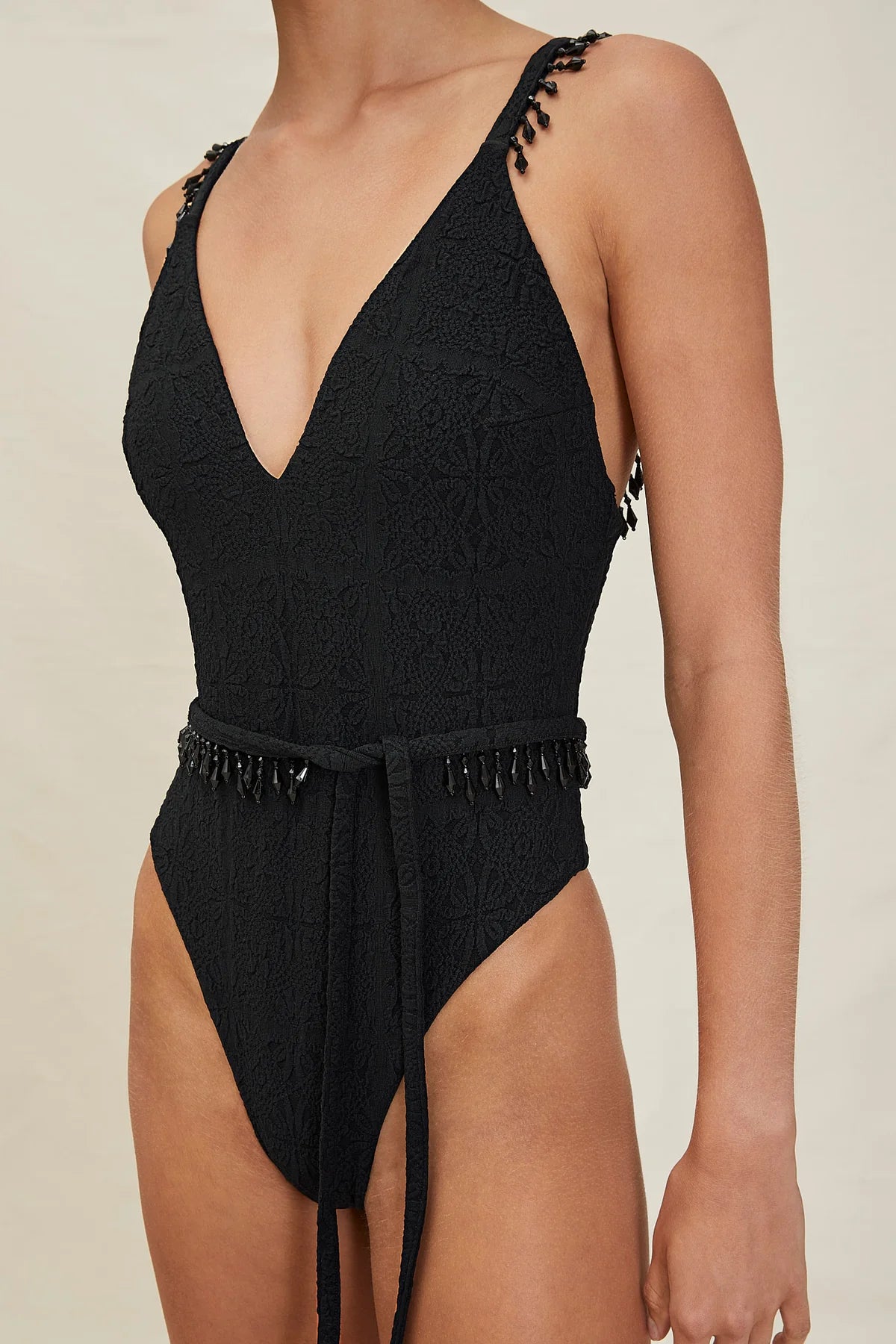 The Dakota is a V-neck, low back full-piece with crystal fringe beaded straps, as well as a removable crystal beaded belt that can be tied multiple ways. Moderate coverage on the back.