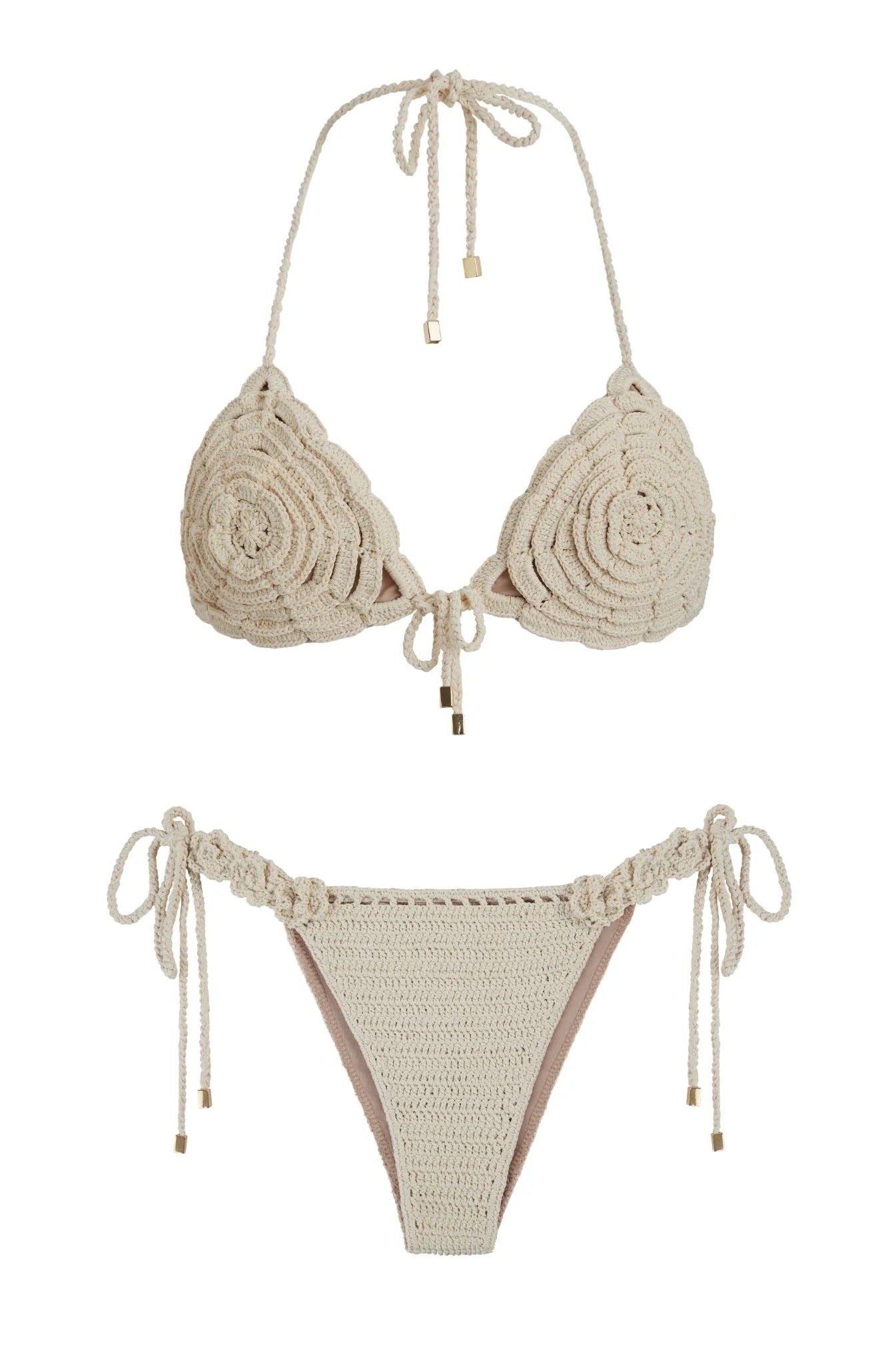 Romantic, refined, and unmistakably luxe. The Love and Roses Bikini Set is handcrafted in off-white crochet blended with elastane for a comfortable, sculpted fit. The triangle top features delicate floral shapes, while the adjustable bottom is adorned with hand-crocheted flowers for a chic, feminine finish. A timeless expression of elegance and artisanal craftsmanship.
