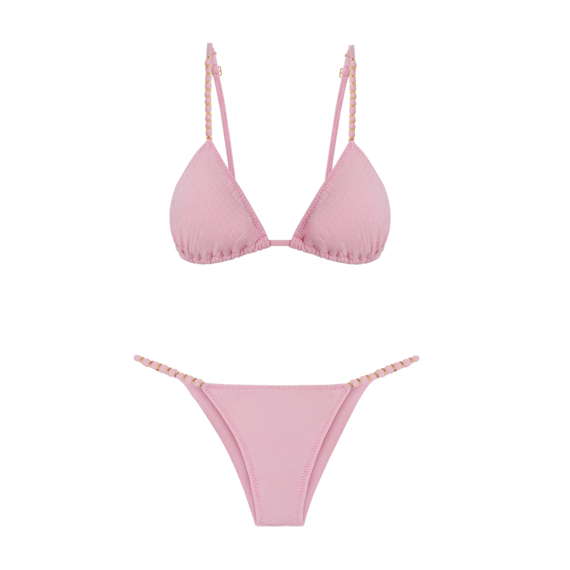 Introducing the Monaco Bikini Set—the epitome of luxury and timeless style. Crafted from sophisticated textured fabric, this two-piece features 18k gold-plated accents and beaded straps on both the top and bottom, adding an artisanal, high-end touch to your swimwear wardrobe. Designed for those who appreciate the finer things in life.