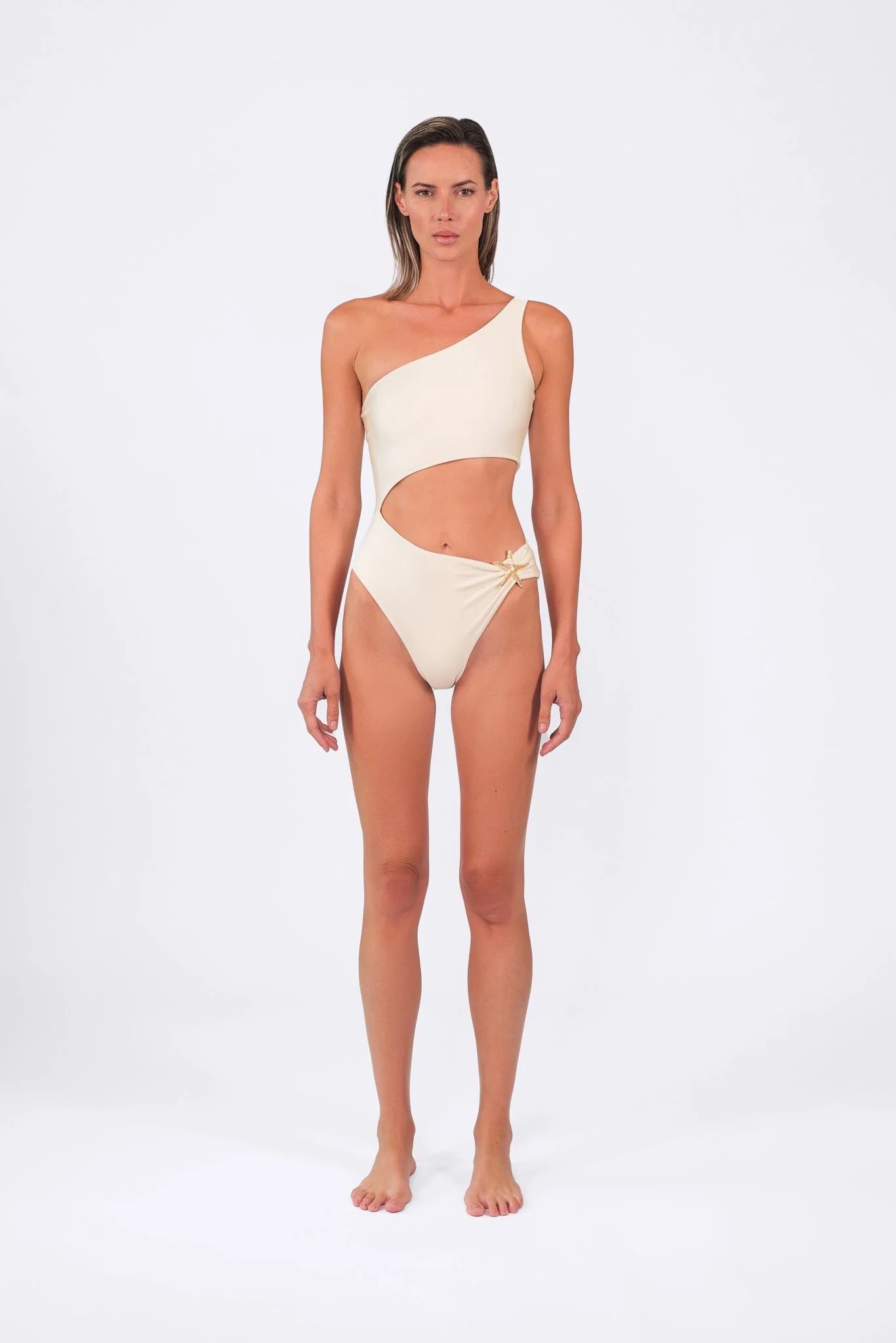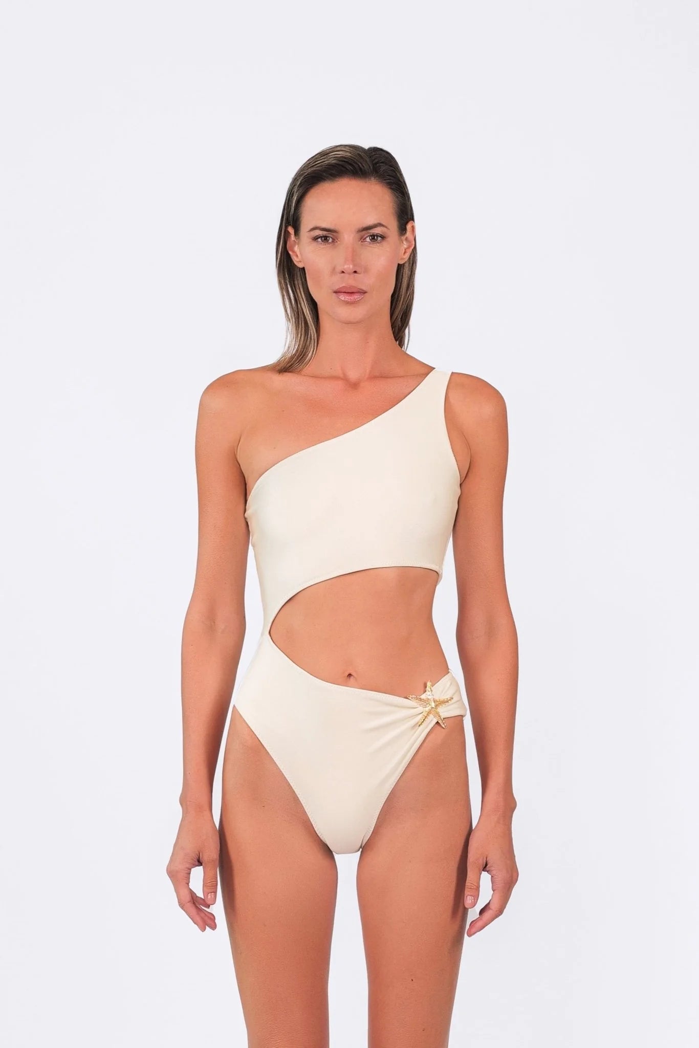 Radiate elegance in this one-shoulder cut-out one-piece, crafted in a luminous champagne metallic fabric. Featuring a high-leg silhouette and removable pads for a flattering fit, it’s finished with waterproof 18k gold-plated star hardware for a touch of refined allure.